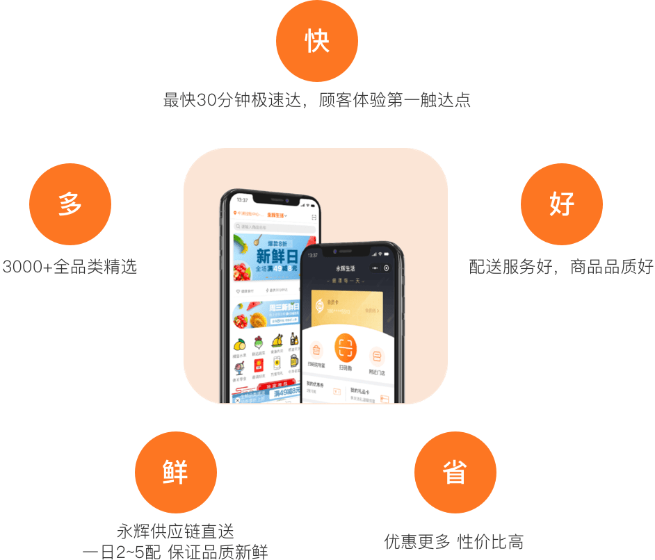 是永輝云創依托全球直采供應鏈、智慧零售科技實力孵化的創新業態。通過貼近用戶的衛星倉、永輝線上超市小程序/APP線上服務平臺、專業貼心的服務團隊,為周邊3公里用戶提供品質生鮮、全球好貨30分鐘配送到家體驗,滿足用戶新鮮、便捷的生活購物需求。