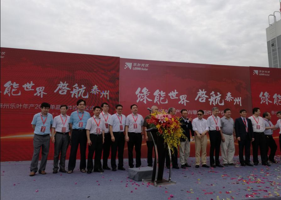 2016年9月6號,細雨綿綿,彩旗飄展,江蘇泰州市海陵區隆基樂葉2GW太陽能電池組件一體化項目舉行隆重的投產儀式。隆基股份董事長鐘寶申發表主旨演講。國務院參事、中國可再生能源學會理事長石定寰、國家發改委國際新能源研究所所長王進、招商新能源CEO李原、泰州市海陵區徐克儉書記等先后發表了熱情洋溢的講話。充分肯定了泰州樂葉建設的高速度、產能的高效化、盛贊隆基股份已成為國際單晶硅、硅片、電池、組件的最大供應商之一。